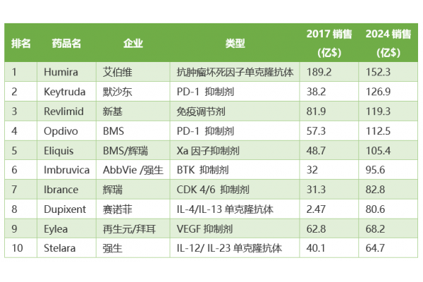 jefferies分析师预计,humira的销售额明年将高达209亿美元。world preview 2018的分析师则认为humira将以每年3%的跌幅下降,2024年的销售额约152.3亿美元,不过仍将继续保持制药业的销售冠军。