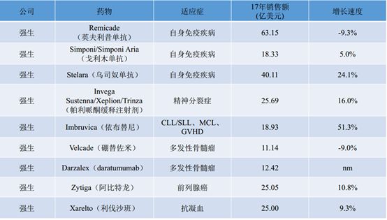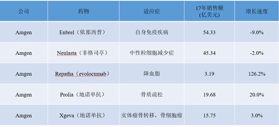 安进,核心产品依那西普,受制于专利到期的影响,市场一再下滑。再者随着非抗肿瘤坏死因子α(tnfα)研发的单克隆抗体或者小分子抑制剂的上市,即使强如阿达木单抗也是压力山大。未来几年之内将会跌出top50销售的榜单。