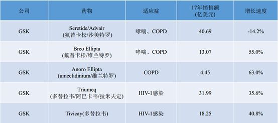 为了应对seretide专利到期,gsk在2013年5月和12月先后推出了两款copd、哮喘新药,分别是breo ellipta(氟替卡松维兰特罗)和anoro ellipta(乌美溴铵维兰特罗)。自推出后市场表现就不俗,保持着高速的增长。breo和anoro在2017年双双放量,增长率分别高达55%和63%,联合贡献17.52亿美元的销售收入,填补了seretide销售额的下滑。