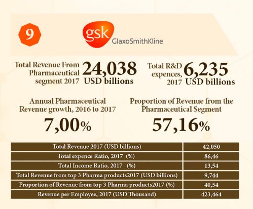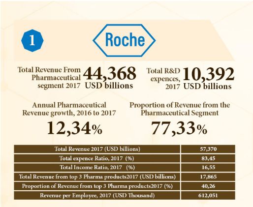 罗氏,17年制药收入为443.68亿美元,仅次于辉瑞的525.4亿美元。不过凭借17年增长速率的优势,拿下榜单的第一名。