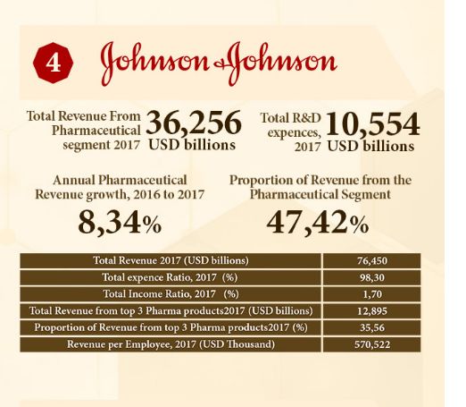 强生,百年老字号,根基牢固,在商海浮沉中依旧保持着强有力的竞争,17年制药收入为362.56亿美元。