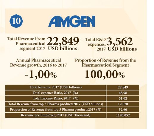 17年安进公司制药收入为228.49亿美元,呈现了负增长。面对来势汹汹的追赶着的阿斯利康和bms等,朝不保夕,可能会跌出top10榜单。