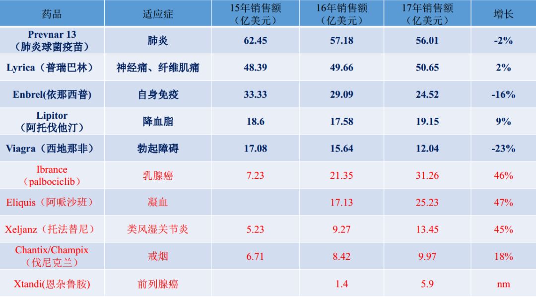 而今,肺炎疫苗prevenar 13、依那西普市场上后期乏力;普瑞巴林专利即将到期,不复当年;ibrance和阿哌沙班的高歌猛进,也是独木难支。