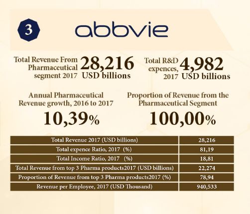 艾伯维,因为阿达木神奇的市场表现,排名已经攀爬到了第三名,17年收入为282.16亿美元。