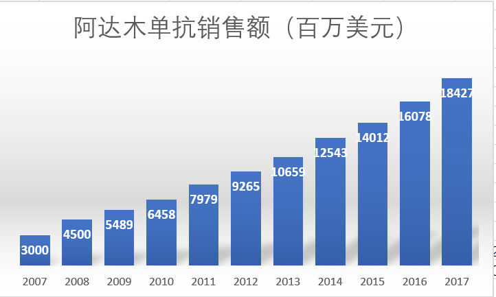 不过这也是艾伯维最头疼的问题:阿达木单抗是公司的支柱,荣辱皆系一身。17年占比为65%,年销售额为184.27亿美元,全年收入为282.16亿美元。