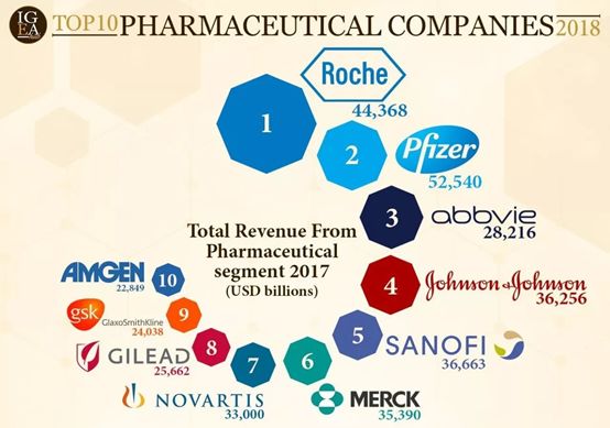 排名按照以igeahub公开发布2018年全球10家最佳制药公司的完整名单为准,融合了evaluate pharma的行业解读,参照17年药企的公司年报,加入了个人对于研发趋势和市场走向的分析。