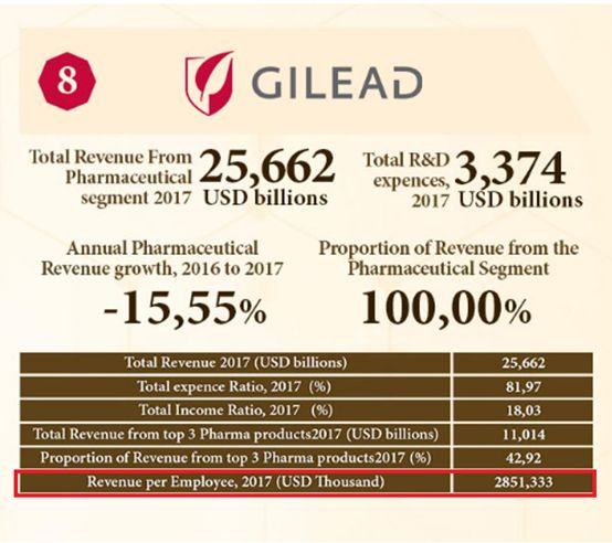顺便吐槽下,吉利德公司17年人均年收入达到了285万美元,远远拉开了和其他药企的距离。有钱就是任性。
