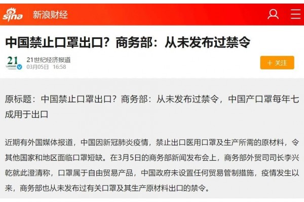 回答:商务部已对外说明,口罩等疫情物资可正常出口。