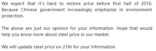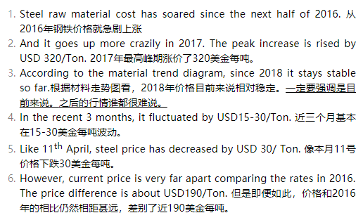 接下来这三段小白想表述,价格很难维持与2016年上半年一致。且受中国环保潮的影响,她会及时更新市场行情给客户。