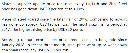 这三段她想表达,材料供应商每月初,中旬,下旬都会更新材料价格变动。再者,这两年的材料价格飞涨的厉害,她想列出一些数据让客户心里有数。