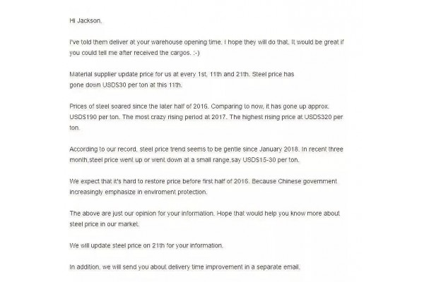 ②因为客户在观摩市场行情,所以与其被动说我等你进一步消息,或者希望这些信息,让你更了解钢材价格波动,不如提出你需要他付诸行动的请求:请告知采购数量,我好进一步做报价给你。