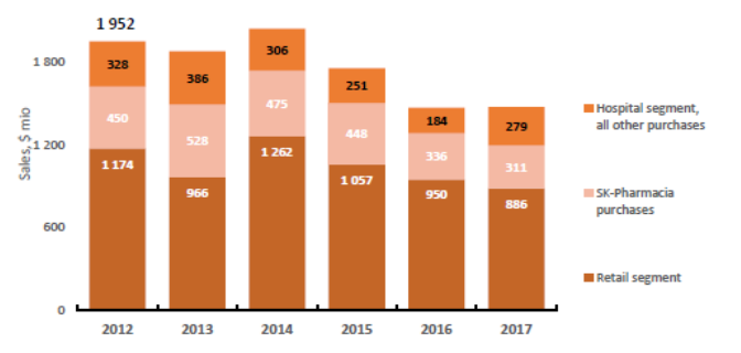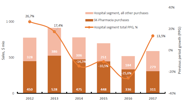 政府的支持是医药行业增长的主要驱动力之一,因为公共采购占医药市场的40%。但是,由于本国货币贬值,2014年医院支出开始下降,市场同比下降14%,而2015年则同比下降7.6%。在2016年,下降幅度更大-同比下降35.4%。经济的稳定使医院的销售在2017年同比增长了13.5%。医院市场的主要部分(2017年金额的52.7%)与独家分销商sk-pharmacia有关,sk-pharmacia成立于2009年,主要从事药品和医疗设备的采购并提供在保证的免费医疗范围内向医疗组织提供。 2013年,公司100%的资金转移到哈萨克斯坦医疗保健和社会发展部。多家分销商的主要业务方向是: