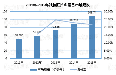 在我国,随着全面放开二孩政策的实施,妇产科设备市场需求巨大,每年以10-15%的速度上升,2015年,市场规模已突破108亿美元。预计到2021年,市场总额将达到150亿美元。