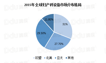 目前欧盟地区是全球最大的妇产科设备需求市场。2015年其妇产科设备市场规模为446.4亿美元,占比为31.0%;北美市场规模为398.9亿美元,占比为27.7%。亚太市场规模为424.82亿美元,占比为29.5%。