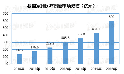 2011年我国家庭医疗器械行业市场规模为176.6亿元,2016年行业市场规模已达到600亿元,年复合增速达到20%左右。
