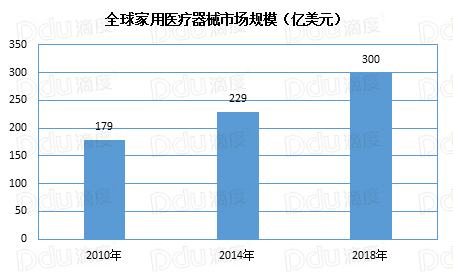 根据研究机构bbc research的最新调查指出,全球家用医疗器械市场发展迅猛,市场规模从2010年的179亿美元增至2014年的229亿美元,年复合增长率达到6.7%。至2018年,家用医疗器械市场规模有望达到300亿美元,行业增速2.12%,高于医药市场整体增速3.81%。