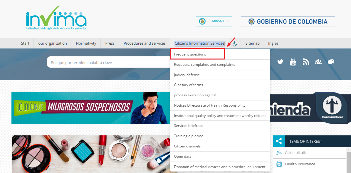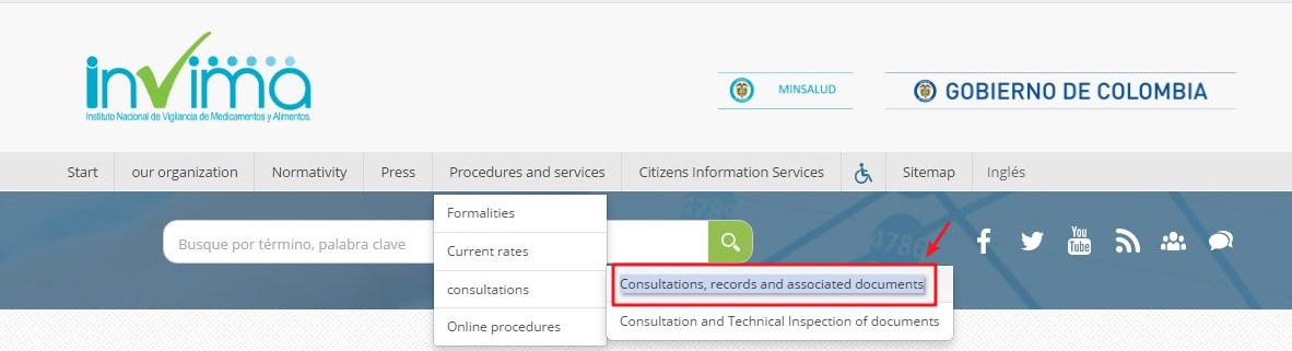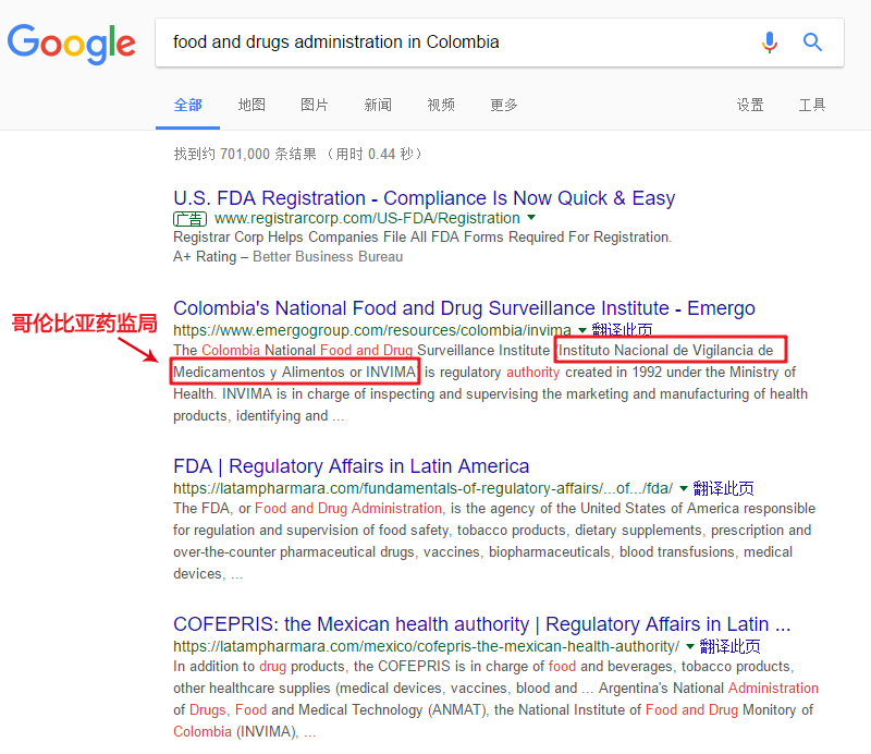 如果不会西语的话,可以先在谷歌搜索“food and drugs administration in colombia”,如下图: