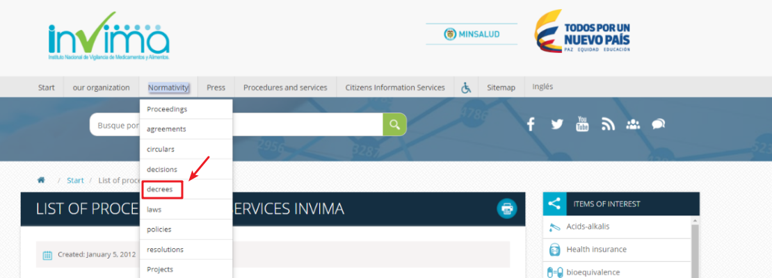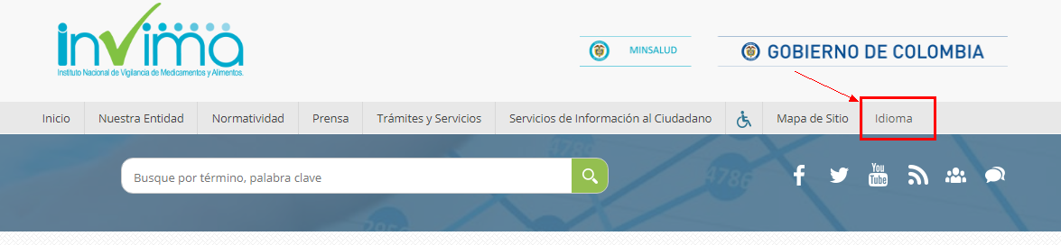 invima的官方网站默认西语,可能会让小伙伴们不知所措,其实点击右上角的“idioma(语言,与英语中的idiom非常像)”选项,可以切换英语、葡语等五种语言。