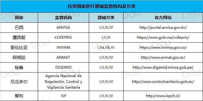 除了哥伦比亚,小d还给大家列出了一些主流拉美国家对应药监局机构及器械分类,上述步骤同样适用。